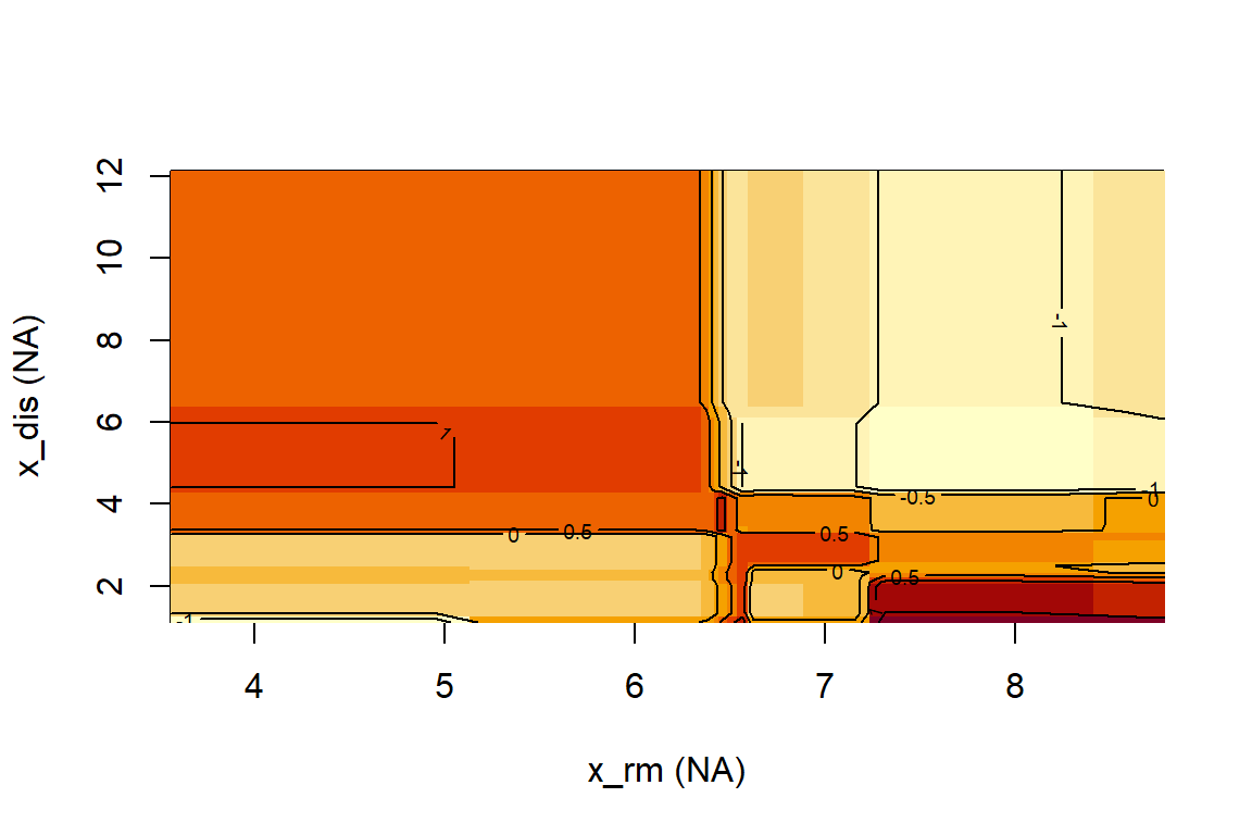 ale.2 d <- ALEPlot (X, model, DALEX:: yhat, c ("rm" , "dis" ))