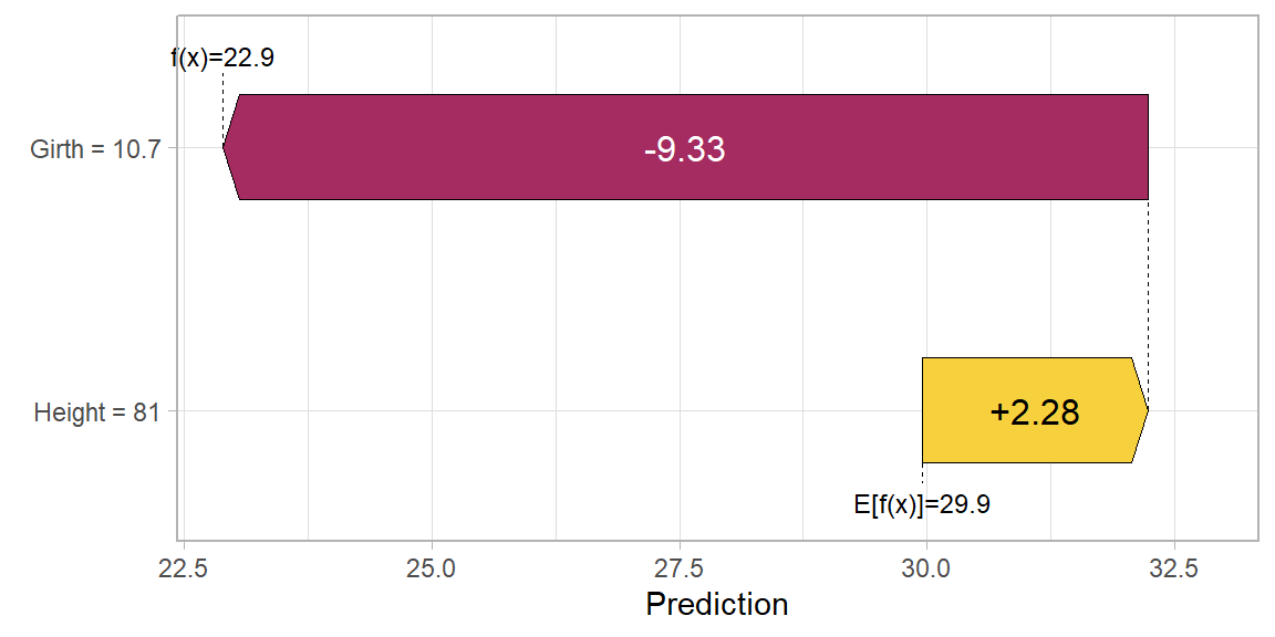 ここでは、例として、trees データセットの Volume を Girth と Height から予測するモデルを作成し、そのモデルに対して解釈手法を適用してみましょう。