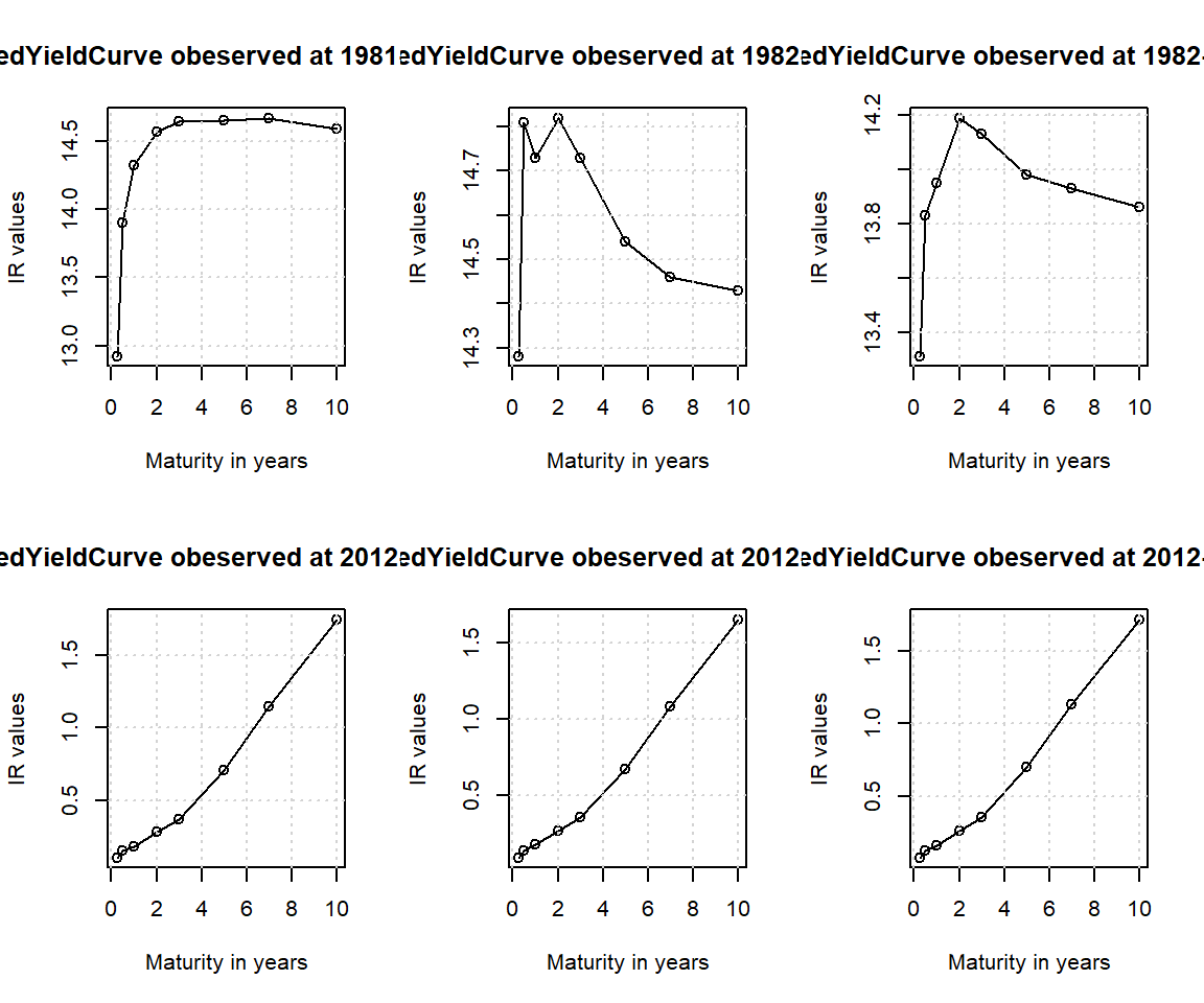 YieldCurveには、連邦準備銀行(FRB)と欧州中央銀行(ECB)の金利の期間構造のデータセットが含まれています。以下ではFRBのデータを取得してイールドカーブをプロットします。このデータセットは、1981年12月末から2012年11月末までの範囲の様々な満期(3ヶ月、6ヶ月、1年、2年、3年、5年、7年、10年)による米国財務省証券定常満期(CMT)の月次の市場利回りです。プロットしてみると、1982年と2012年ではイールドカーブの形状が大きく異なっているのがわかります。