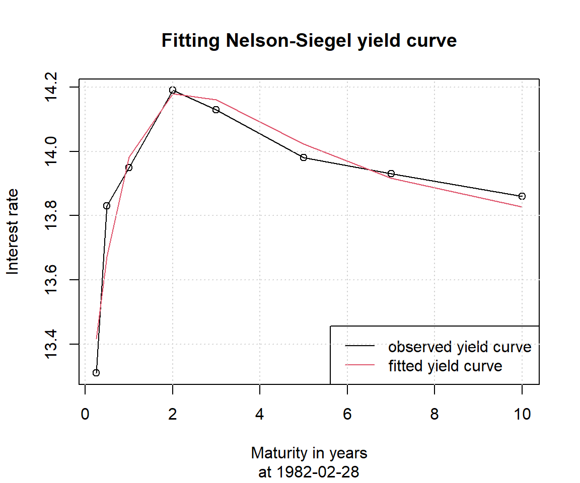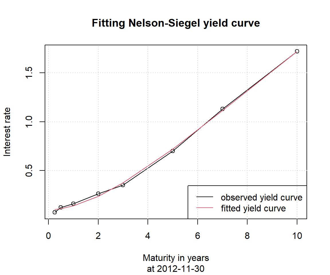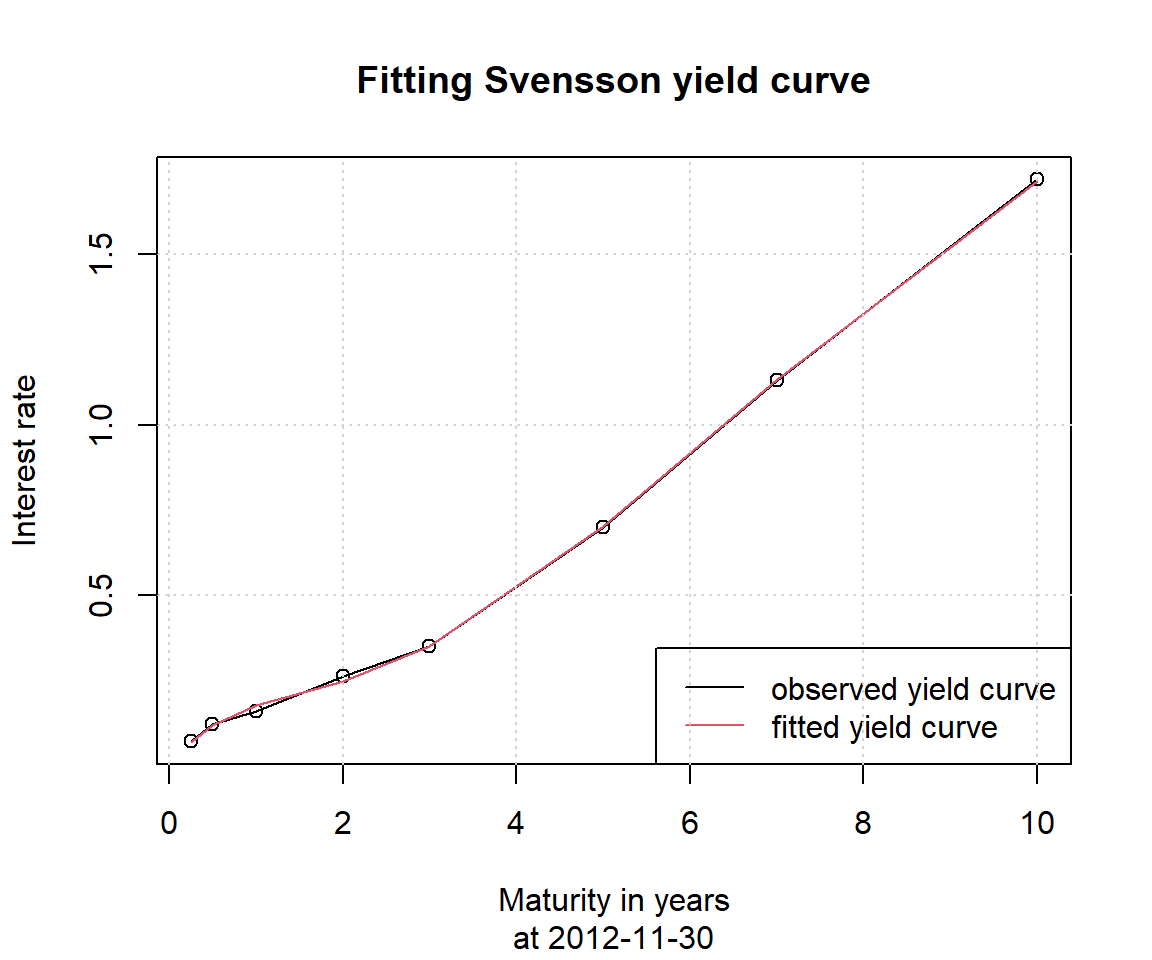 legend("bottomright", legend=c("observed yield curve", "fitted yield curve"),