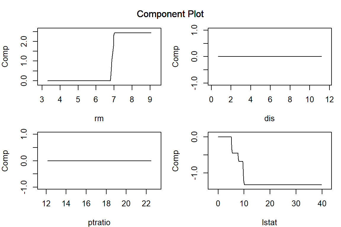 構築した AGLM モデルを plot() 関数に渡すことで、特徴量ごとの予測値への影響を可視化することができます。正則化項としてラッソを用いる場合、\lambda を大きくするほど、離散化した区間ごとに当てはめられた効果水準の差が消失して意味のある区間の数が減少していき、(add_linear_columns = FALSE としている場合)最後には特徴量の効果は消失します。