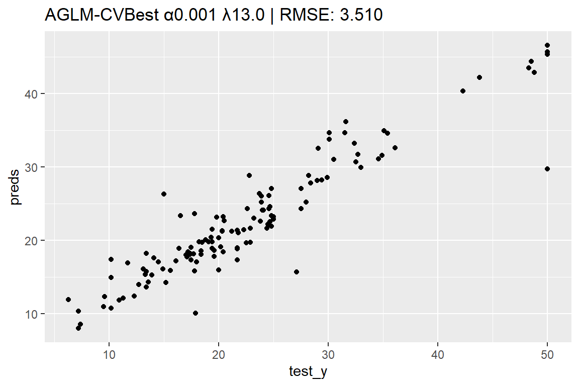 また、predict() 関数に学習済みの AGLM モデルと新たなデータを渡せば、そのデータに対する予測値を出力することができます。なお、aglm は glmnet パッケージを活用して実装されており、出力される “AccurateGLM” オブジェクトには多数の\lambda の値に対応する結果が保存されています。“AccurateGLM” オブジェクトに対する predict() 関数のメソッドの引数 s の値を指定することで、正則化の強さが異なるさまざまなモデルによる予測値を得ることが可能です。