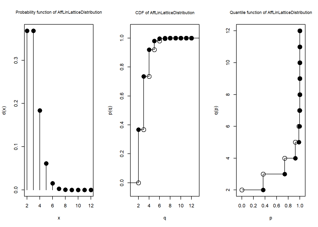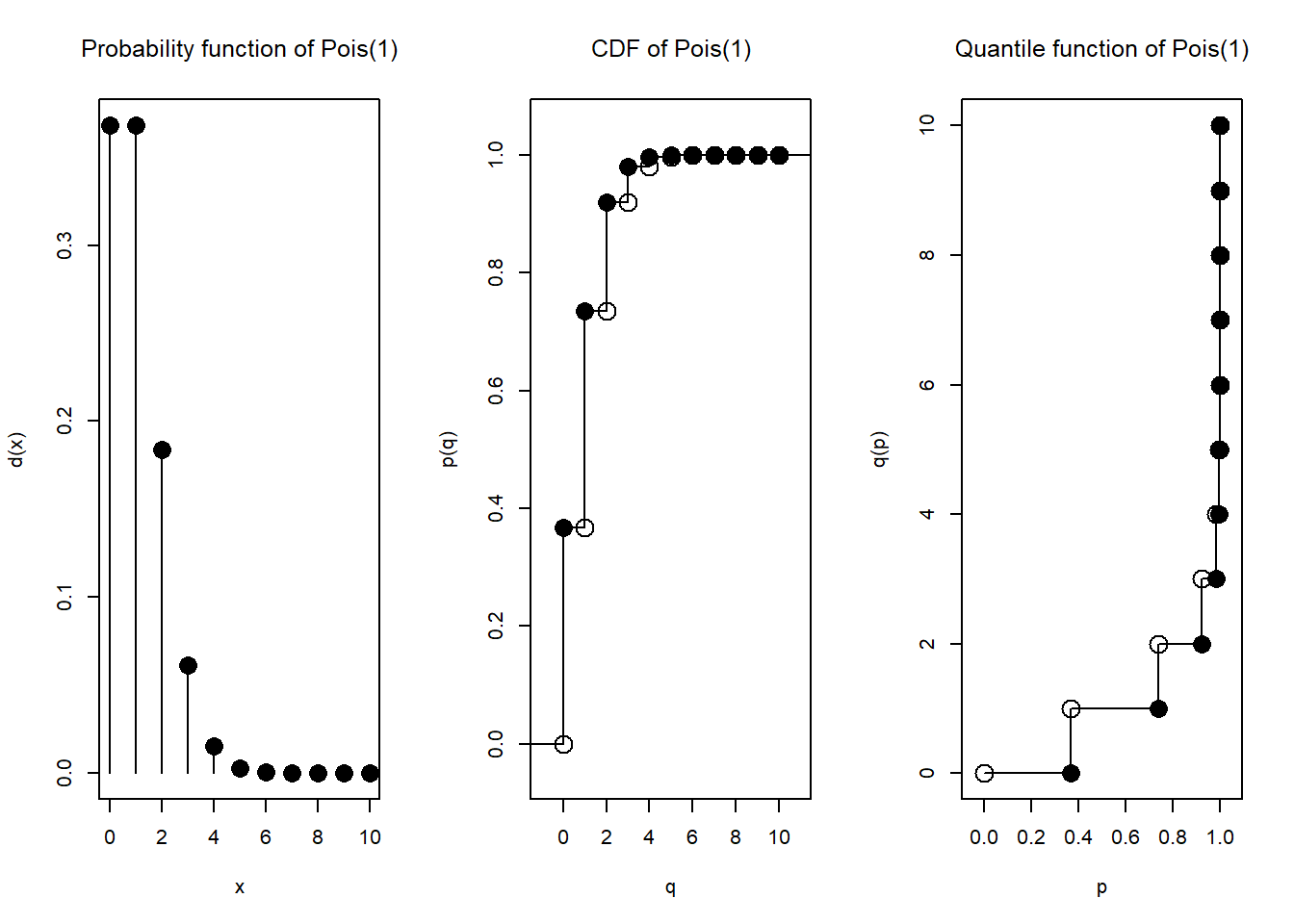 一般の分布のクラスに対しても同様にplot関数が適用できます。 上のコードで変換した確率変数N1についてplot関数でd、p、qの関数値を表示すると、ポアソン分布を平行移動した分布になっていることがグラフからも確認できます。