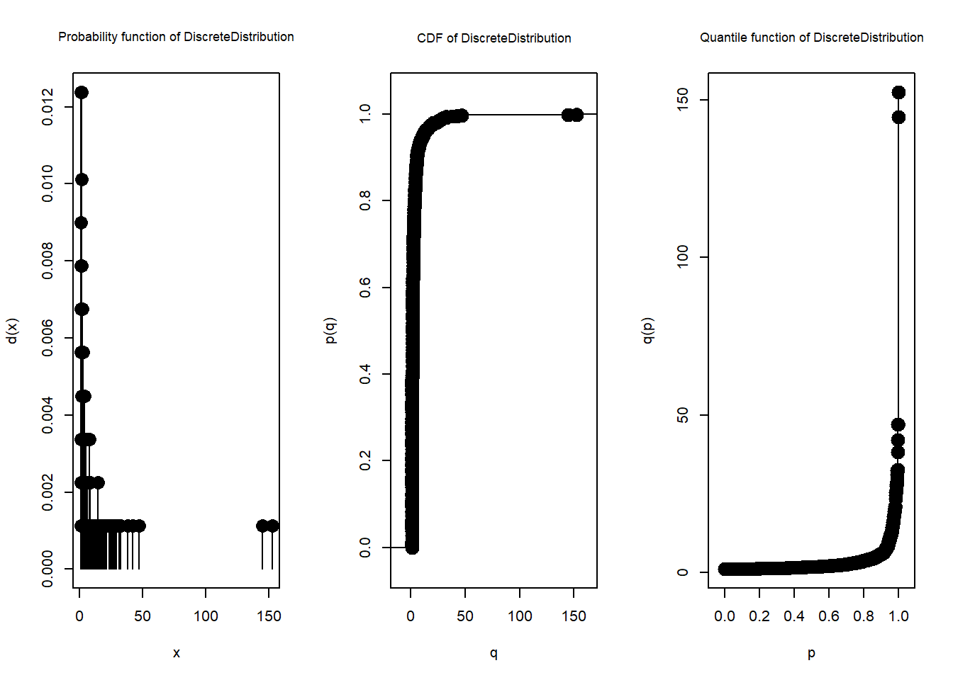 S <- CompoundDistribution(NumbOfSummandsDistr = N_pois, SummandsDistr = X_exp)複合分布に対してはr、p、q関数が使用できます。 また複合分布の機能として、もととなっている分布(今回の場合ポアソン分布と指数分布)を取り出すことも可能です。