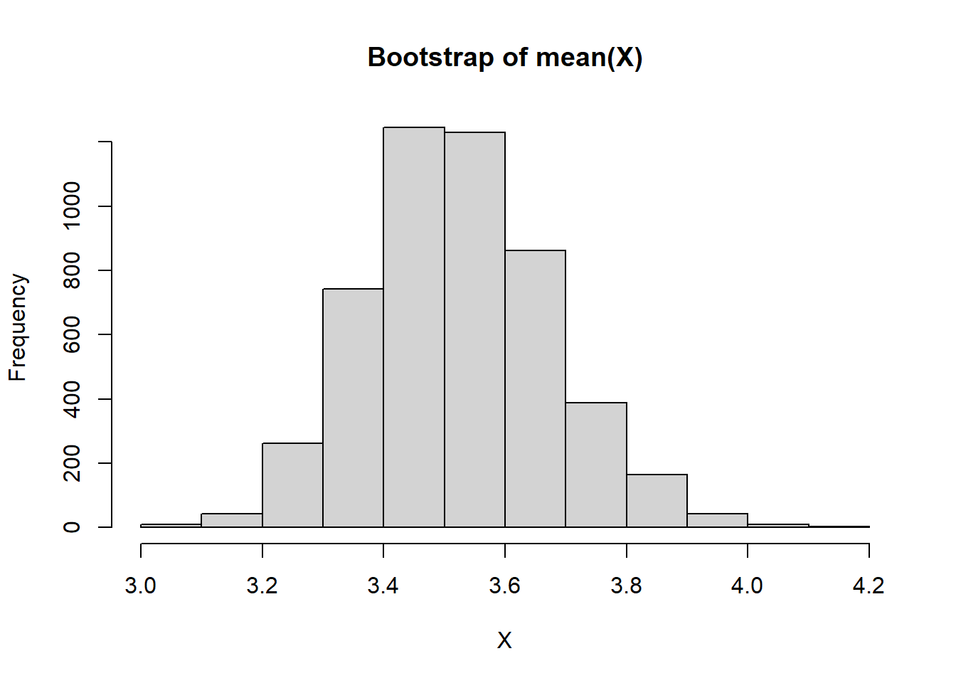 hist(res, main = "Bootstrap of mean(X)", xlab = "X")