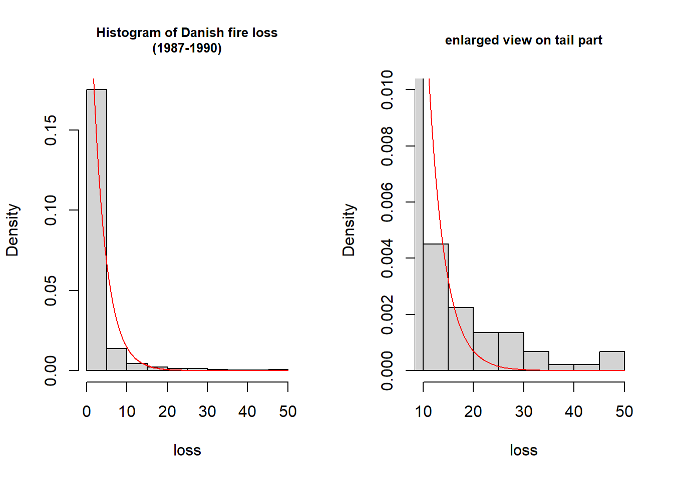 main = "Histogram of Danish fire loss\n(1987-1990)", cex.main = 0.8,