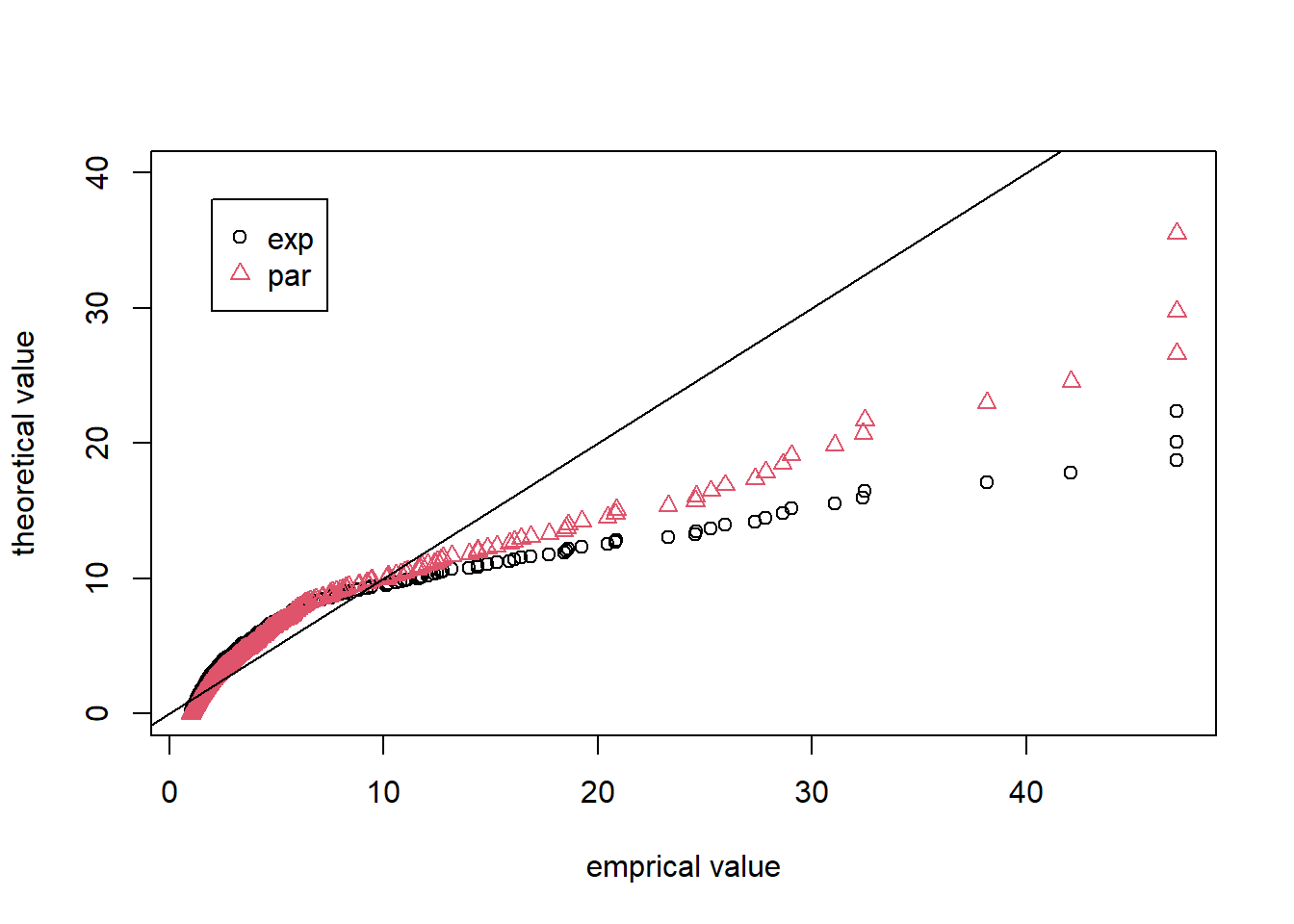 legend(2, 38, c("exp", "par"), pch = 1:2, col = 1:2)