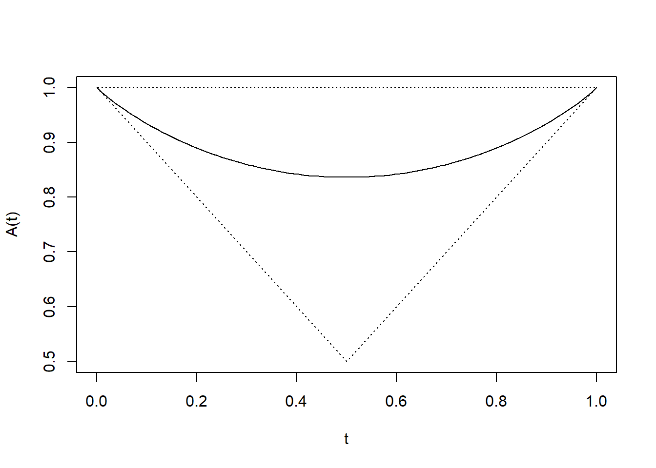 作成した二変量極値分布について、abvevd関数を用いれば従属構造を確認できます。「plot = TRUE」とすることで従属関数がプロット表示されるので、2つの変数間の極端な値の同時発生に対する従属関係を可視化できます。