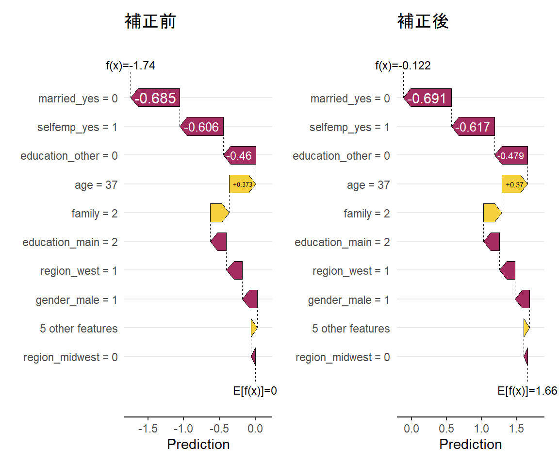 個別の予測値 = その予測の説明変数1の寄与 + \cdots + その予測の説明変数Nの寄与 + 予測値平均