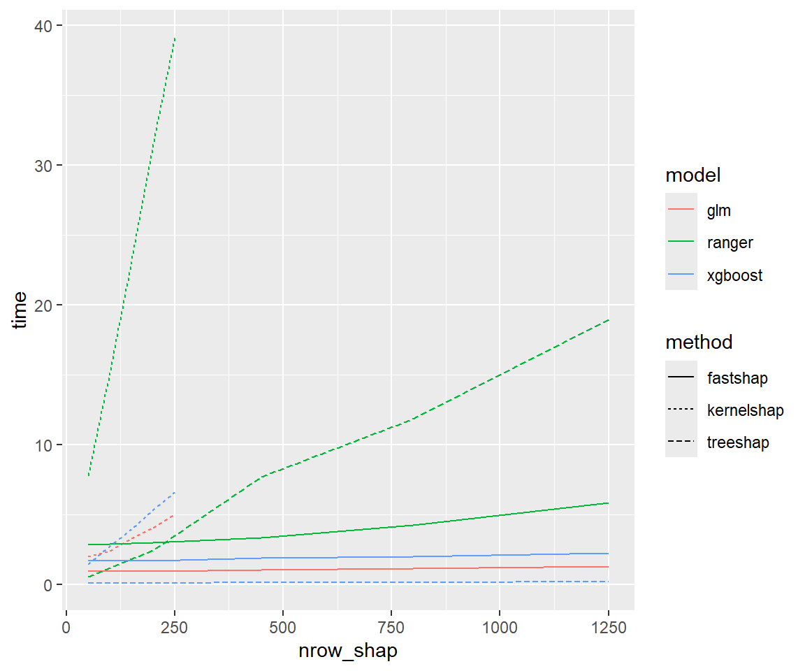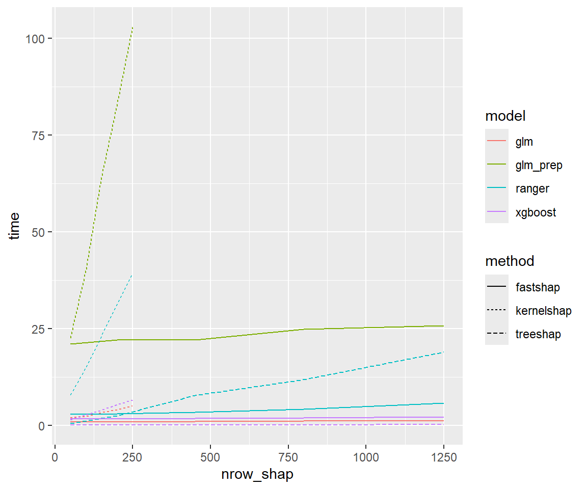 mapping = aes(x = nrow_shapbg, y = time, color = model, linetype = method)) +