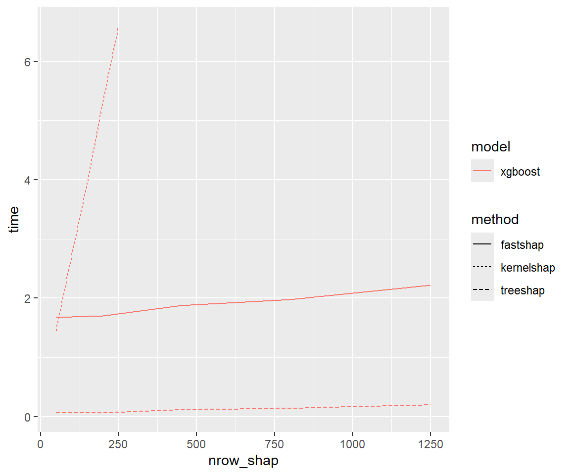 サンプル数を増やしてもfastshapはあまり計算時間が増えませんが、 kernelshapは比例的に計算時間が増加します。 treeshapは非常に高速ですが、rangerではツリーの構造のためなのか、サンプル数を増やすとfastshapと逆転します。