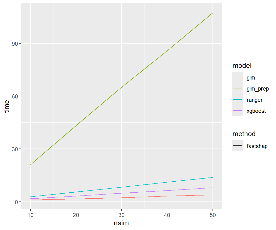 ggplot(data = results %>% dplyr::filter(nrow_shapbg <= 50, nsim <= 10, model != "glm_prep"),