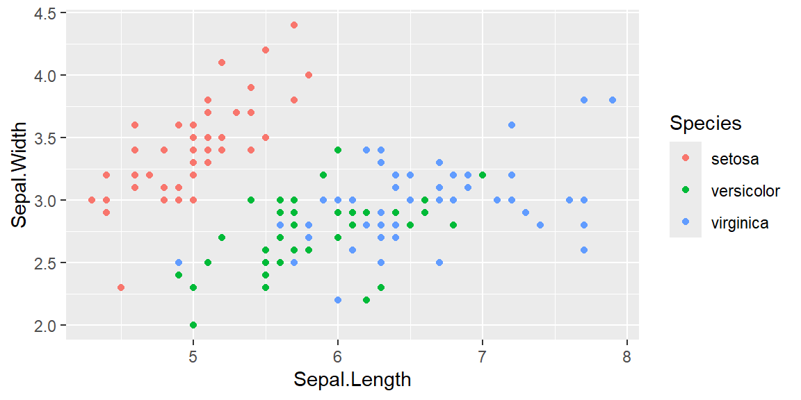 ggplot2では、+演算子を利用してggplot関数に様々な関数を接続することでグラフを作成します。 以下では、geom_point関数を用いて、Rのデータセットiris(アヤメの花びらやがく片の長さなどに関するデータセット)を用いた散布図を作成しています。