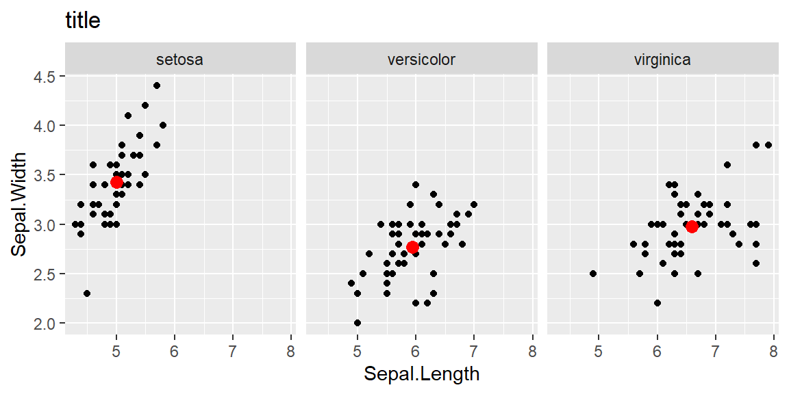 以下では、アヤメの種類別のがく片の長さと幅を計算したiris_meanを用いて、散布図を重ね合わせています(表示されたグラフの赤い点が平均値です)