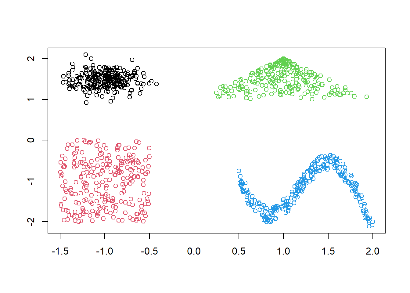 以下は、指定したクラス数のクラスごとに、2次元空間上で正規分布するデータを生成する、mlbench.2dnormalsの使用例です。 これらの生成関数によるデータは、R標準のS3 classという機能を用いて、as.data.frame関数とplot関数が適切に動作するように実装されています。 すなわち、List形式で返される生成データを引数として、as.data.frame関数によるデータフレームへ変換、およびplot関数による生成データの種類に応じたグラフのプロットができるようになっています。