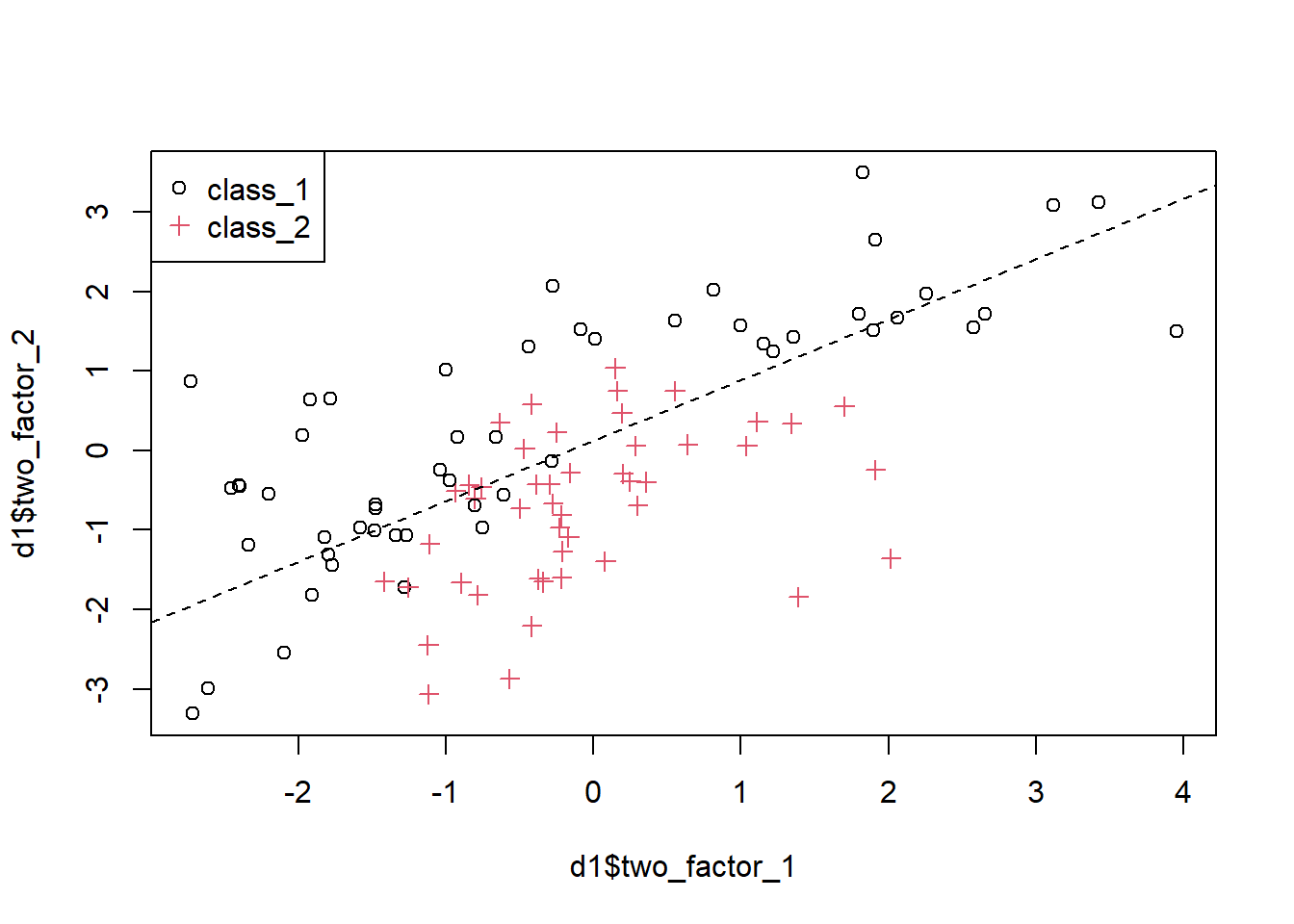 sim_logistic関数及びsim_multinomial関数は、それぞれ2クラス分類および3クラス分類用のデータを生成します。 平均0、分散1、相関係数が引数correlationに従う正規乱数AおよびBの2変数を説明変数として使用しますが、クラス確率を計算するためのAとBの算式を、柔軟に設定できる点が特徴です。