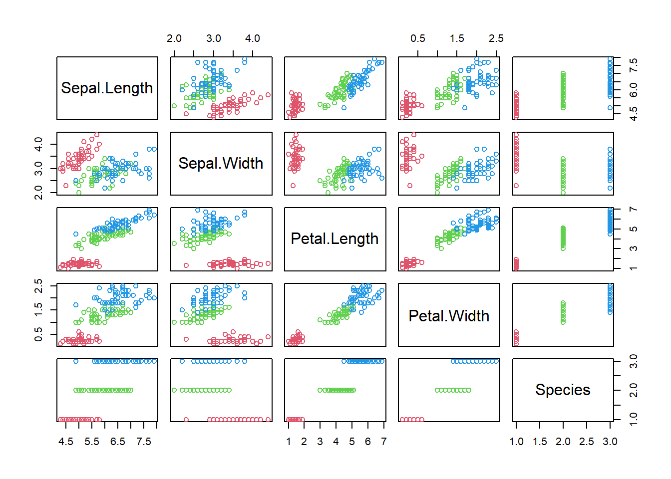 plot(iris, col=c(2, 3, 4)[iris$Species])