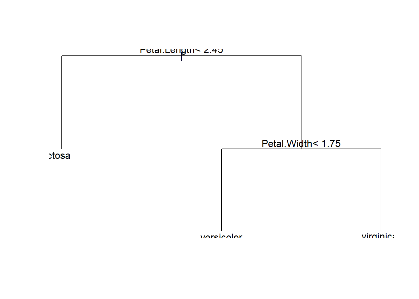 2) Petal.Length< 2.45 50 0 setosa (1.00000000 0.00000000 0.00000000) *