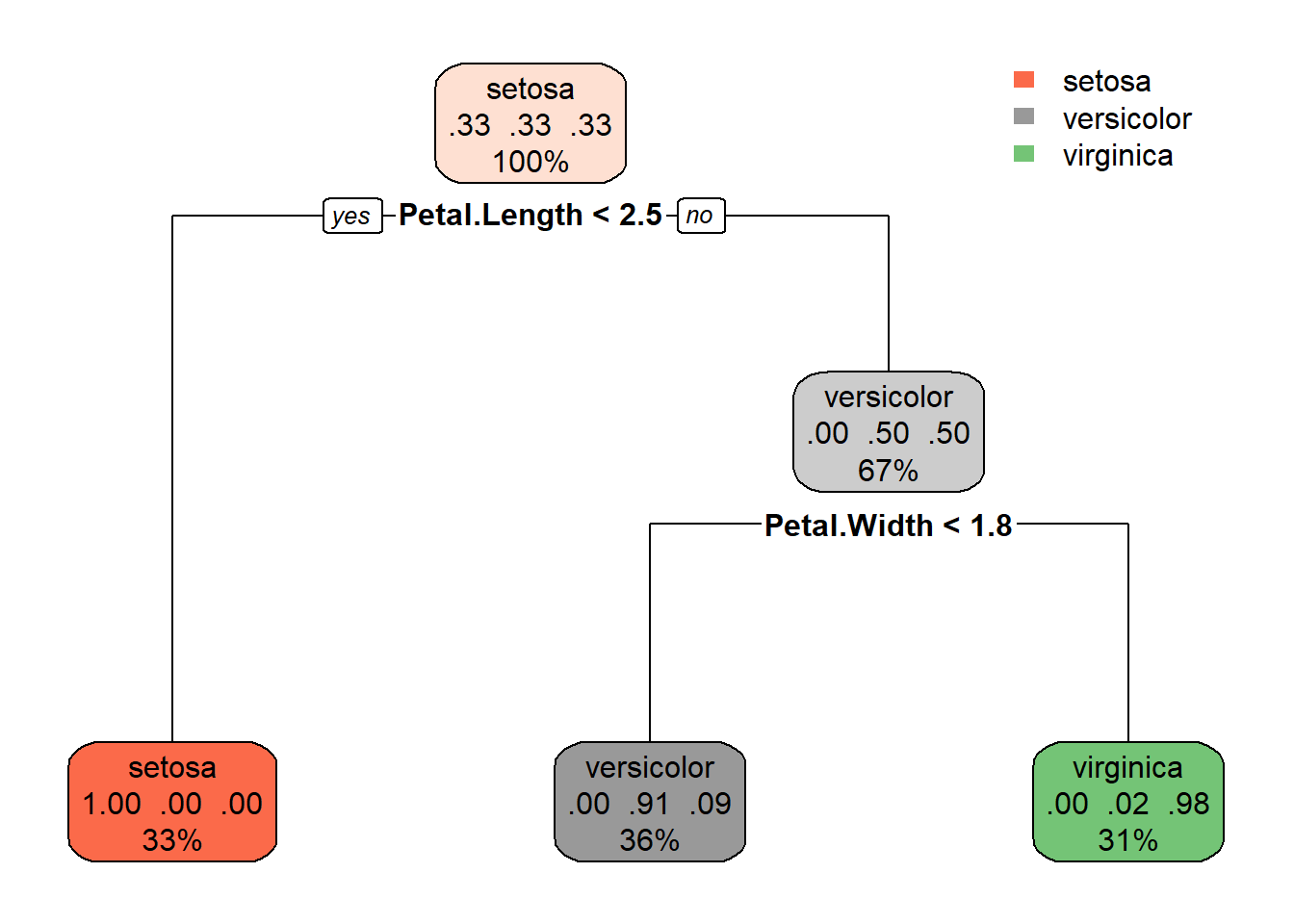 3) Petal.Length>=2.45 69 32 virginica (0.00000000 0.46376812 0.53623188)