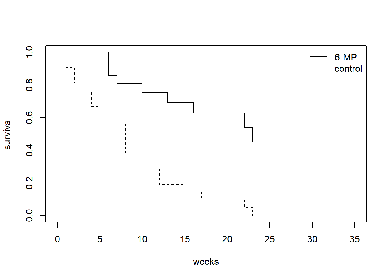 legend("topright", levels(gehan$treat), lty = 1:2)