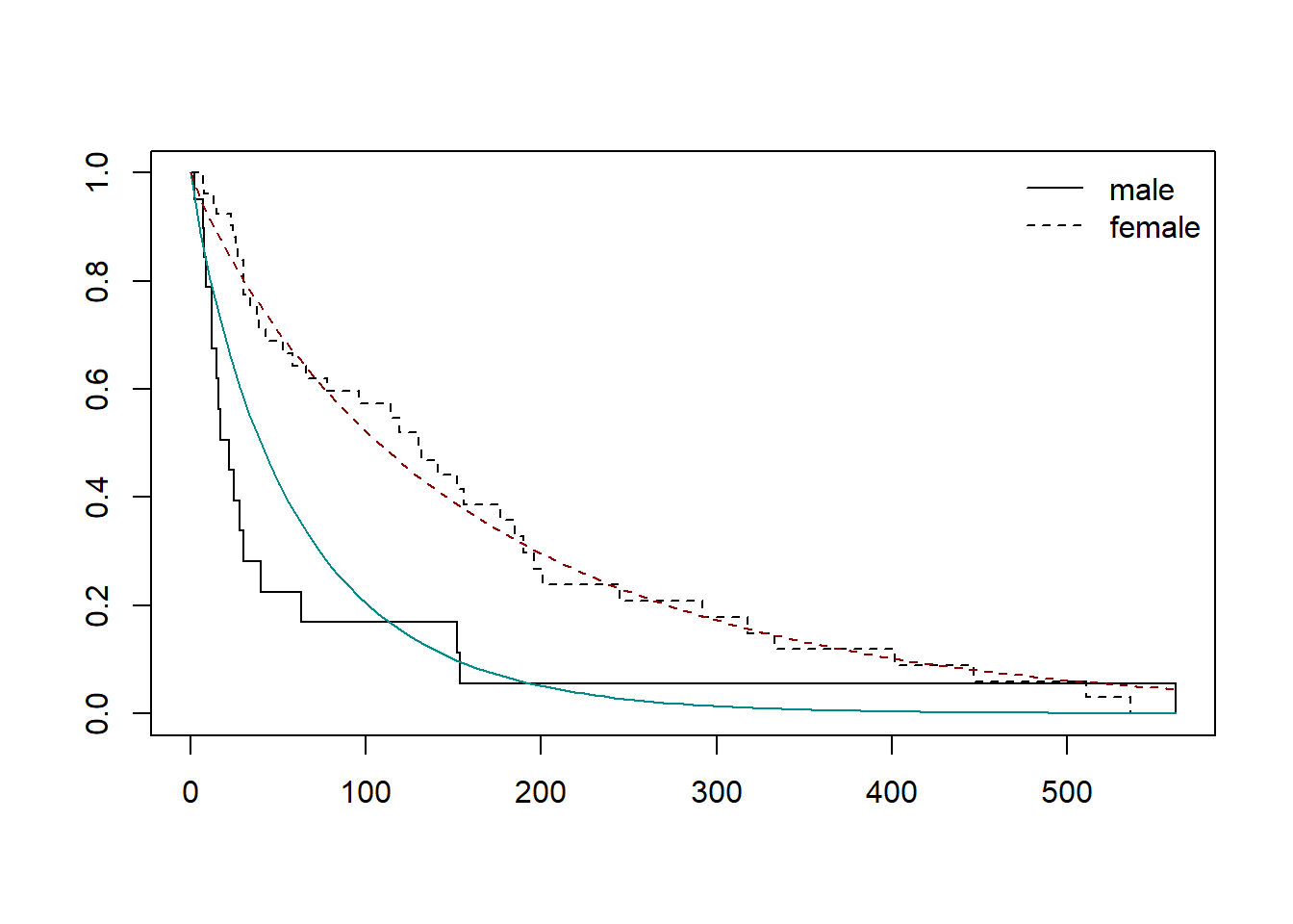 legend(21, 1, c("Cox", "Kaplan-Meier"), lty = 1, col = c("black", "gray"))