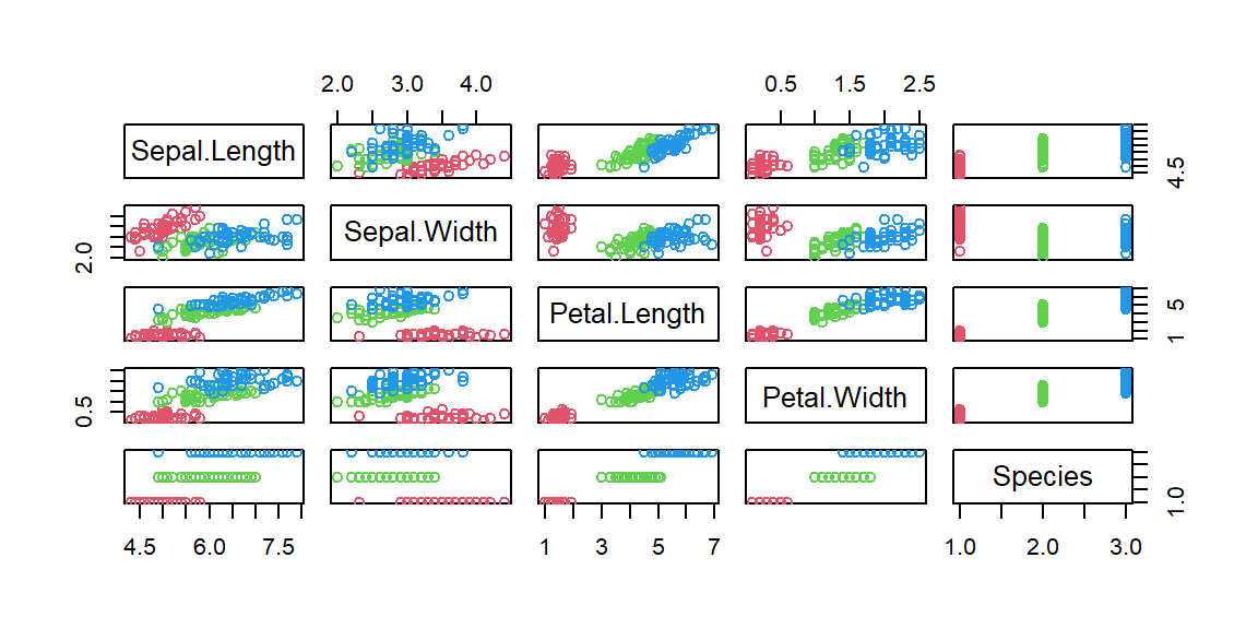 plot(iris, col=c(2, 3, 4)[iris$Species])