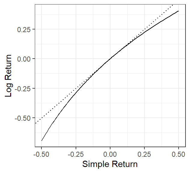 ここで、\(R_a = 0\) の近傍では \(R_\ell=\ln (1+R_a) \approx R_a\) であるから、価格の変化が十分小さければ算術収益率と対数収益率は互いに近い値をとる。