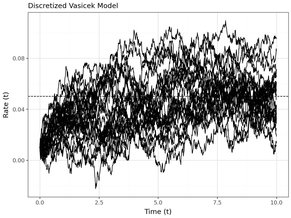 Vasicek モデルは、金利が長期的にみれば一定の水準 \(\theta\) に引き戻されるという平均回帰性 (Mean Reversion) を取り入れた瞬間金利のモデルである。