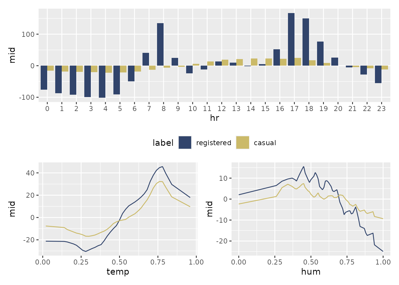 Instead of comparing different algorithms, we might want to understand how features simultaneously affect different segments of our target variable. Here, we interpret a single model predicting both “registered” and “casual” users.